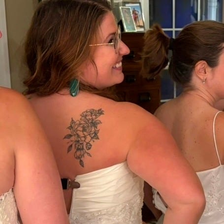 One of the pictures that I insisted we take was a photo of the non-zipped dresses for those of us whose dresses didn’t fit. It’s maybe my favorite picture of the night, but that might be because I don’t often get to show off my beautiful peony tattoo, which is one of many ways my body is different (and better!) than it was in 2011 when I got married. I only got that lovely tattoo this year.